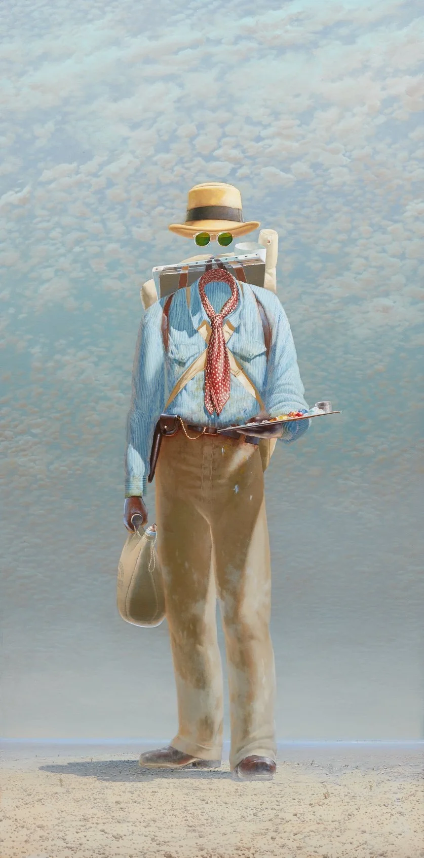 Impedimenta is an old word and simply means an obstacle to walking. Here he is, a personification of legends; Atlas, Sisyphus, “the swagman” or wanderer - always in search of sustenance or enlightenment. He is a surveyor or aesthete savant searching the horizon for unattainable indicators of beauty and tonal harmony. The depicted figures carry the practical tools of a painter; a palette, a case of paints, rolled paper, brushes and a stretched canvas. His water bag to quench thirst and meld colours. These figures are autobiographical and by implication a type of self-portraiture. A figure in the landscape can be imbued with many and subtle nuances; stance, the attitude of the head and equipment carried can indicate purpose, the time of day and the mood, if not his fate. In the end I suppose the dialogue in these works has to do with a lost fool trudging endlessly towards a glistening mirage. I paint such ephemera as it is a poetic reality, possibly even a pessimistic delight for me. And so the musings of the Wayfarer go on as always….. futile. I may be painting pre Modernist pictures, maybe, I hope so.