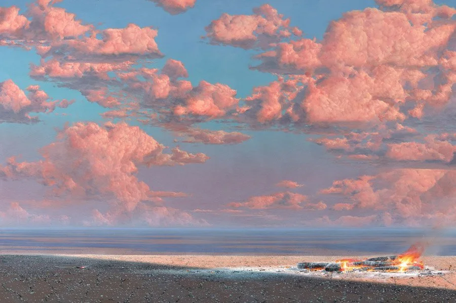 When putting a collection of pictures together a dialogue commences between each painting and I try to understand the relationship between each painting and how the group of paintings relate to the viewer. When I look at an object; be it a Georgian spoon, a Mercedes Benz, or a piece of fine art I always find it instructive to consider the materials involved and the intent of the designer and how successfully this intention has been realised. There is also a process in making a painting. First you have to decide on the scale. I look carefully at the wooden stretcher, I use cedar as it is light, strong and resistant to insects. Next I choose the canvas; the weight, texture and weave of this will reflect on the brush marks on the painting’s surface. Then I choose the gesso (underpaint) that the image will be painted on. This also affects the quality of the surface. After an infinitesimal number of aesthetic and poetic decisions have guided the image to completion (to one’s satisfaction) consideration must be given to how you want to present the work. That could involve the colour of the wall on which the painting hangs. In the ‘A Distance Away’ series I wanted to ‘box’ the distance in a traditional frame.