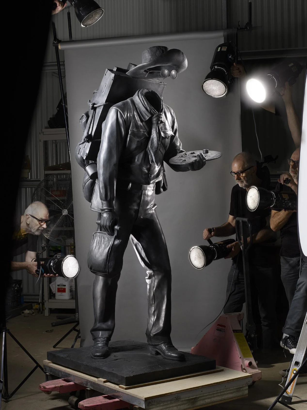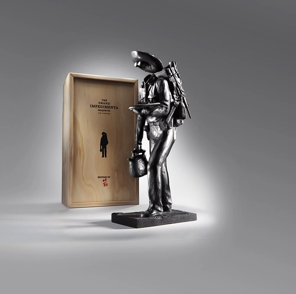 The Impedimenta carries the practical tools of a painter; a palette, a case of paints, rolled paper, brushes and a stretch of canvas. His water bag is an uplifting drink to quench thirst and meld colours.
